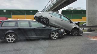 Pięć samochodów zderzyło się w dwóch kolizjach na trasie S8 w Warszawie. Jedna z nich miała dość nietypowy finał - jedno auto wjechało pod drugie. Zdjęcia otrzymaliśmy na Kontakt 24.