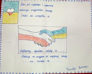 Laurka przedstawia dwie ręce: jedna w barwach Polski, druga w kolorach Ukrainy - w braterskim, porozumiewawczym uścisku. Rysunkowi towarzyszy krótki tekst: "Polska jest najlepszym i najbardziej oddanym przyjacielem Ukrainy. Dzięki za wszystko". Dziewczynka zwraca się również bezpośrednio do dyrektora: "Najlepszy dyrektor szkoły. Dziękuję za przyjęcie do najlepszej szkoły na świecie".