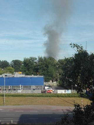 Wysoki słup dymu, ogień wewnątrz hali. Płonie sortownia odpadów