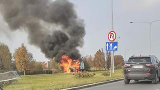 Auto w płomieniach na autostradzie. Są utrudnienia w ruchu. Nagranie