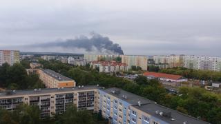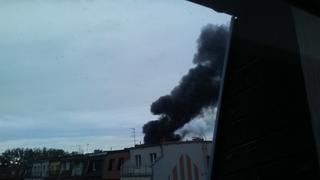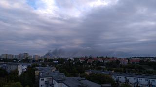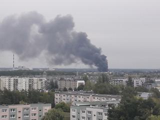 Wysokie płomienie, kłęby gęstego dymu. Zakład produkcyjny w ogniu